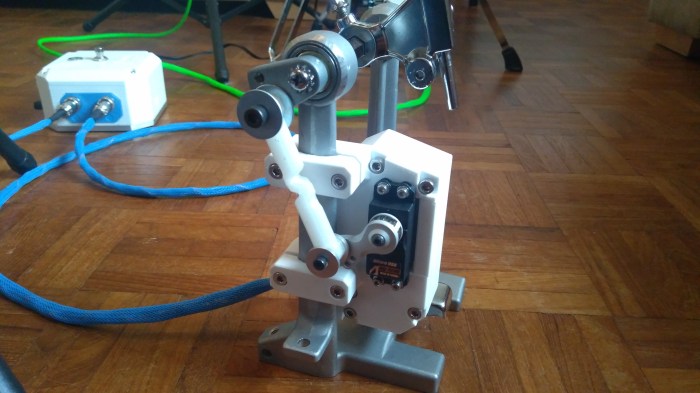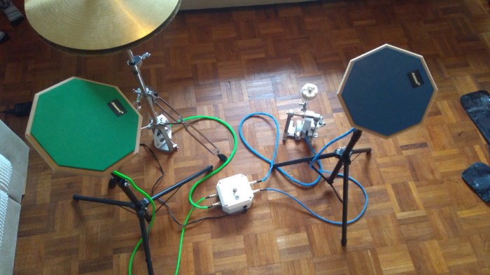 - Design and build of a drum kit adaption to allow playing only by hand, by means of remotely actuated servo-assisted pedals, utilising Arduino microcontrollers.